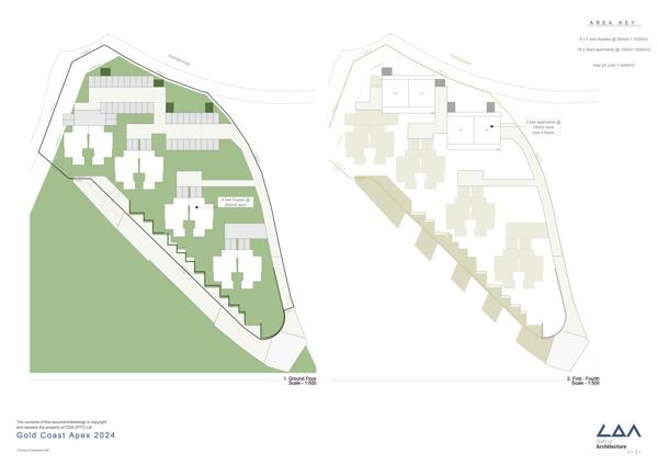 The Apex enhances the Gold Coast experience with 4400m2 of smart-ready 2, 3, and 4-bedroom sectional title homes, all boasting panoramic ocean views. This site now accommodates 24 units, comprising: