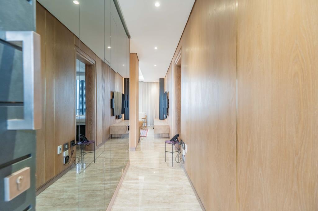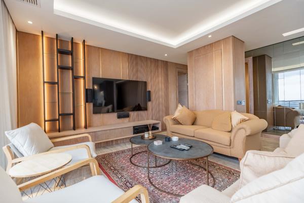 The apartment offers three well-appointed bedrooms, with the master featuring a luxurious en-suite bathroom, ensuring comfort and privacy. The contemporary design extends throughout, with warm wood paneling, elegant marble flooring, and integrated lighting enhancing the sophisticated aesthetic. A private balcony provides an ideal spot to enjoy the coastal breeze and stunning vistas.