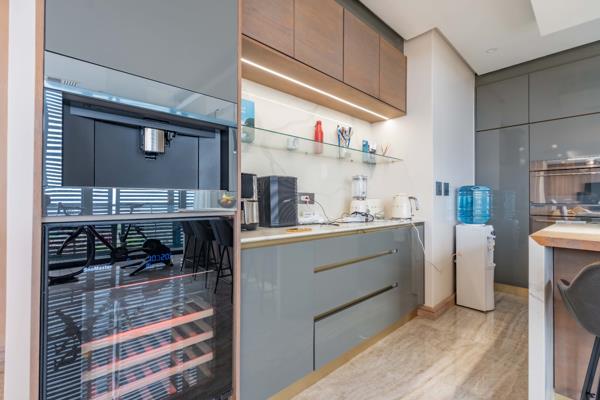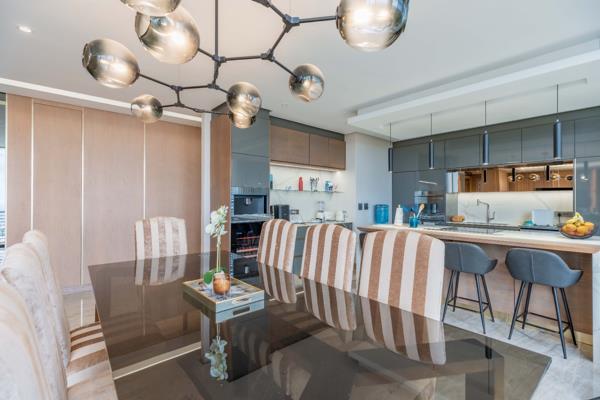 Discover sophisticated coastal living in this exquisite 3-bedroom, 2-bathroom apartment located within the prestigious Sibaya Precinct, Umhlanga. Spanning 189.00 sqm, this modern residence boasts an open-plan design, seamlessly integrating the lounge, dining area, and a sleek kitchen. The kitchen is a culinary delight, featuring glossy grey cabinetry, a spacious island with an integrated cooktop and bar seating, and high-end finishes, complemented by stylish pendant lighting. Expansive floor-to-ceiling windows flood the living spaces with natural light and offer breathtaking panoramic ocean views, creating an unparalleled ambiance.