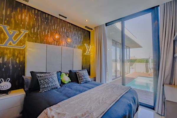 Four luxurious en-suite bedrooms, including a master suite with a walk-in dressing room, full bathroom, and private garden or pool access.