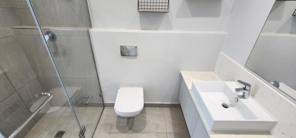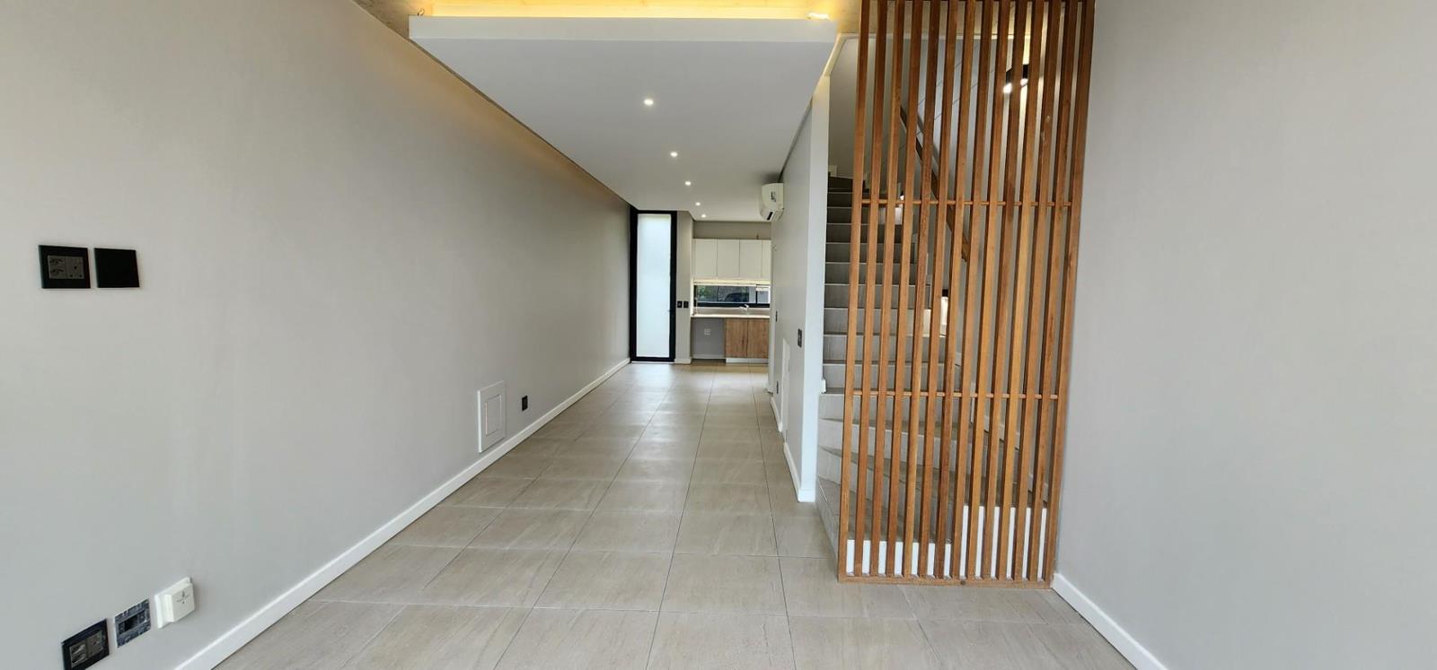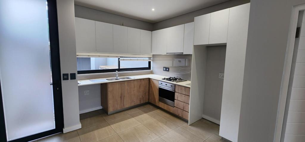 Step inside to an open-plan living area, featuring modern finishes throughout. The sleek designer kitchen flows seamlessly into the dining and lounge spaces, creating a light-filled and inviting environment perfect for both entertaining and everyday living. Large sliding doors open out onto a small, neat private garden, ideal for outdoor relaxation, weekend braais, or enjoying the coastal breeze.