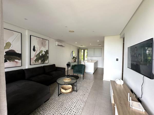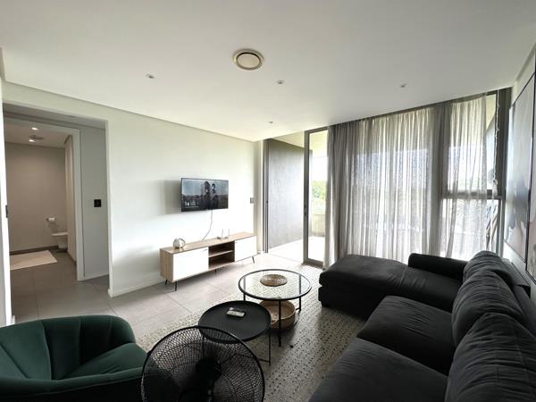Fully furnished 2-bedroom, 2-bathroom apartment with open-plan living and a patio overlooking lush greenery.