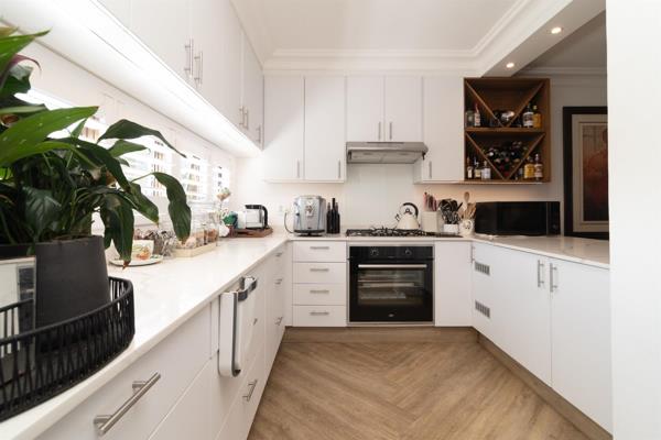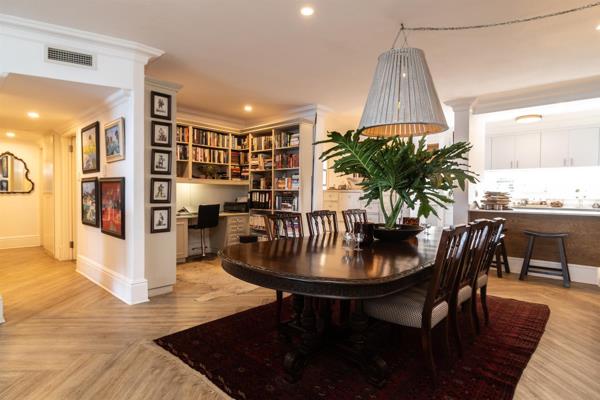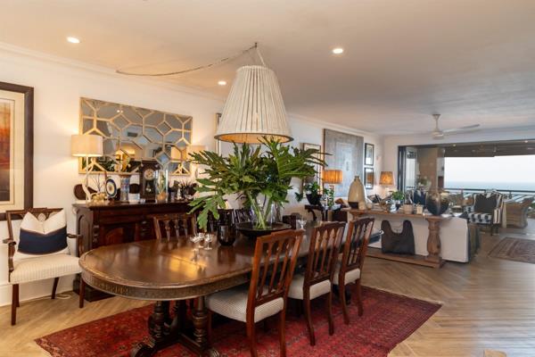 The elegant white kitchen complete with ample stylish cabinetry, and an out of sight scullery area, adjoins a spacious dining room with a beautiful library/office area. The dining room merges into the lounge that flows out on the extensive covered verandah that offers panoramic sea views.