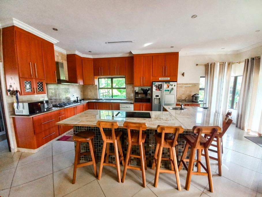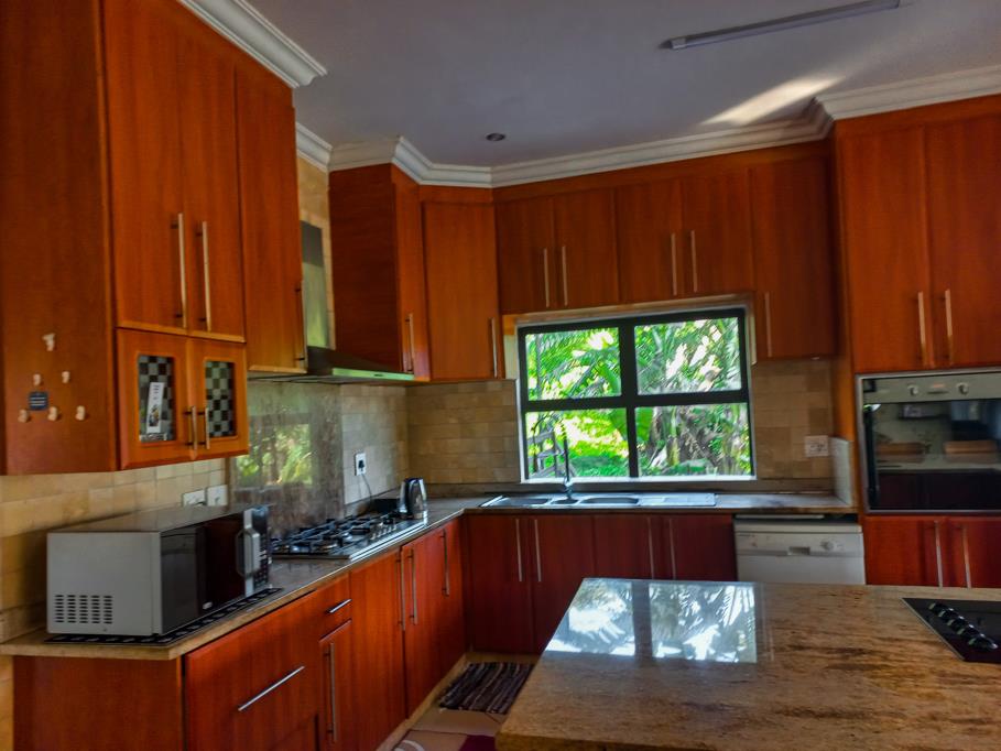 With Magnificent beach views overlooking the lush greenery, this stunning home is built on 3 levels. The entrance level has a huge tile and covered patio, which welcomes you into a spacious open plan fully fitted kitchen with ample granite counter tops, hob extractor and island stove, the dinning room and airy big lounge with a sea view balcony. It also has a lovely guest bathroom.