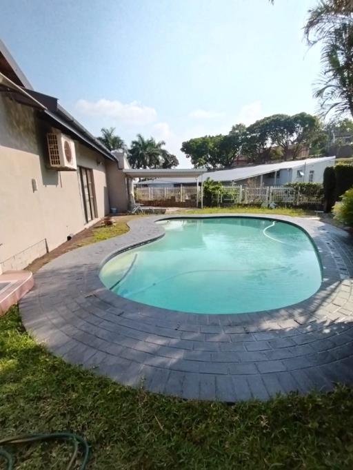 The property features 4 spacious bedrooms, two with en-suites, designed for comfort and relaxation. The dining room flows seamlessly into the lounge, both of which open up onto the pool and garden area. The kitchen is fully fitted with a gas stove and ample cupboard space.