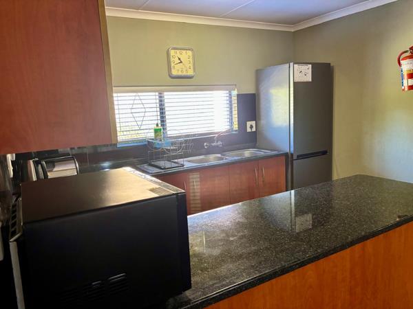 Open lounge (including fire place), dining room and kitchen area, leading to two guests rooms and bathroom. The en-suite main bedroom is generous in size. Sliding doors, from each room, lead to a veranda.