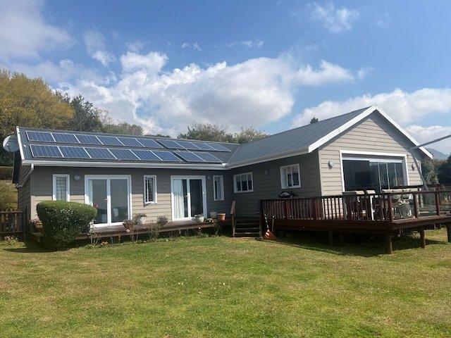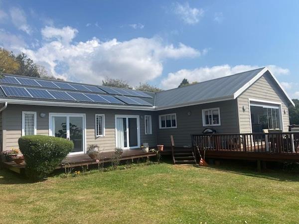 This delightful modern home offers panoramic views and tasteful finishes and is fully solar powered.