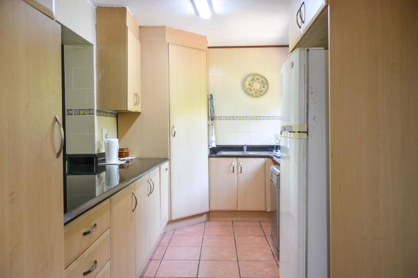 The heart of the home is its beautifully appointed kitchen, adorned with granite countertops and generous storage. The open-plan living room seamlessly extends onto a covered patio, offering delightful garden views, making it an ideal space for entertaining or relaxing.