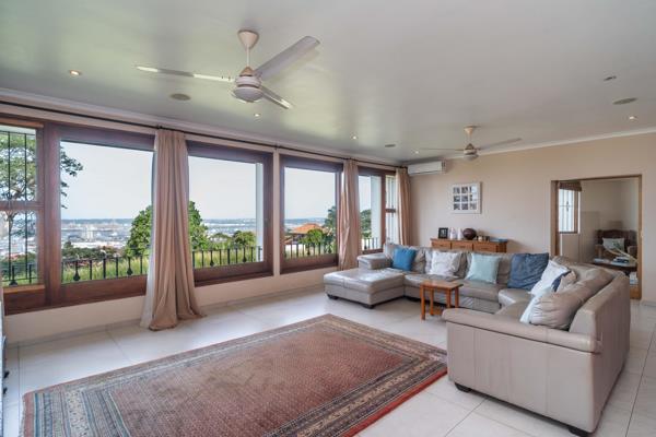Upstairs, youll find an open-plan marvel, highlighted by a large main lounge with sliding doors and windows that offer breathtaking 180-degree views of the sea, greater Durban, and the harbor. A cozy balcony extends from the study/reading room, seamlessly flowing into the dining room, which features beautiful parquet flooring.