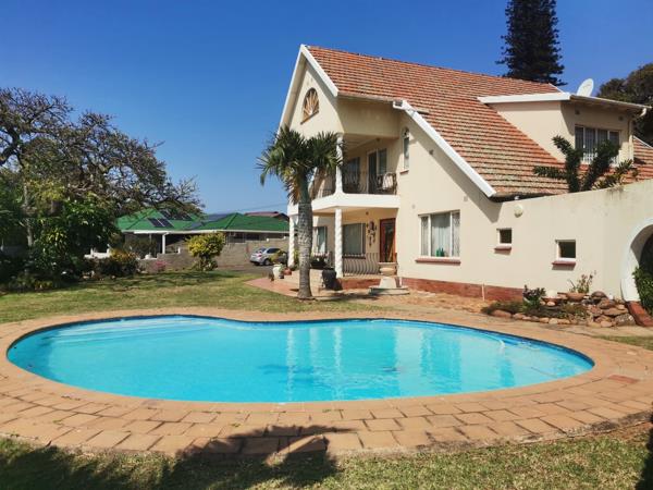 Set on a hill overlooking Amanzimtoti and the ocean, this very Unique ''A'' frame house has everything you could wish for in a home. From the moment you enter through the electric gates, the magnificence of it strikes you. At the top of the driveway, is a large turning circle and three garages and carport, the home is to the right, set in a level manicured garden, with big thatched lapa and lovely swimming pool. As you approach the house up 3 steps, you won''t believe the wonderful pivot front door, with a huge lion painted on it. As you enter, to the right is a small office and then a guest bathroom and further down the passage is a lovely guest bedroom en-suite, with its own entrance. There is a double sized lounge with a separate dining room that leads to the most magnificent, granite kitchen with island and scullery. In the centre of the hallway is an imposing stairway leading up to three more king sized bedrooms, the main one is en-suite and has a big open balcony overlooking Amanzimtoti and the ocean and another study, that could easily be a fifth bedroom. There is a modern large general bathroom also on this floor. The property also includes a separate two-bedroom unit for staff members. If you are searching for something spectacular that offers modernity, comfort and style in a great location, close to beaches and all amenities, then this is for you.