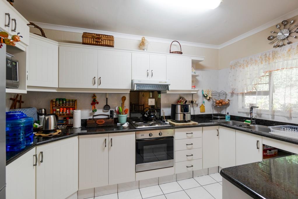 The beautiful granite top kitchen is very spacious with ample cupboards, a built-in under counter oven and hob with extractor fan, and space for all your other necessary appliances. Down the passage find a nifty corner turned into a laundry area for your washing machine and drier - extra space so well utilized.