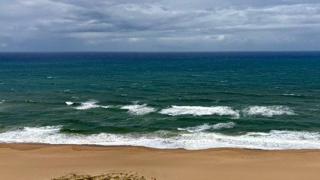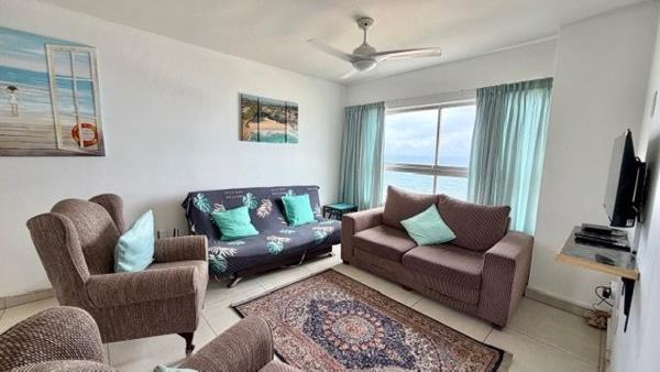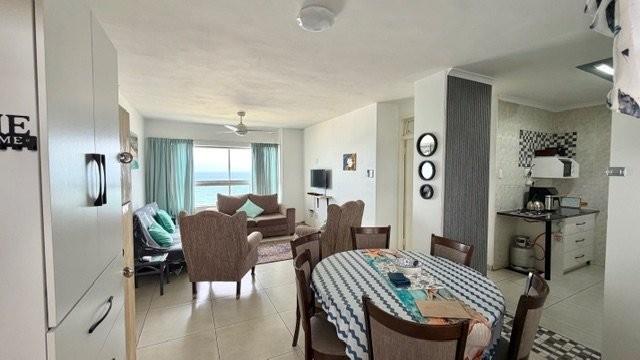 The apartment is tiled throughout and features a stylish, modern kitchen that flows effortlessly into the open-plan lounge and dining area. Large windows showcase the ocean perfectly, allowing both the living space and the bedrooms to enjoy beautiful beach views. The bedrooms include built-in cupboards, while the bathrooms offer a practical setup a communal bathroom with a bath, and a main en-suite with a shower.