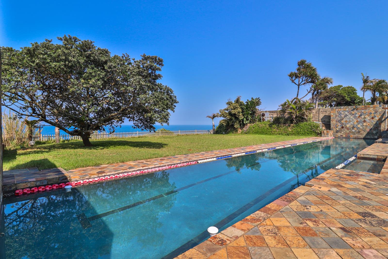 This home is super spacious with extra large living areas and sleeping accommodation. The house itself is about 400 sq. m. There is a sprawling living area comprising dining, living room, open kitchen and breakfast nook that opens out to a large covered patio with built in braai, views and the extra large pool. You could entertain 100 people... or find a nook for a small group of friends or family. The pool is 25 meters long with views beyond. Get your exercise in this gorgeous pool.