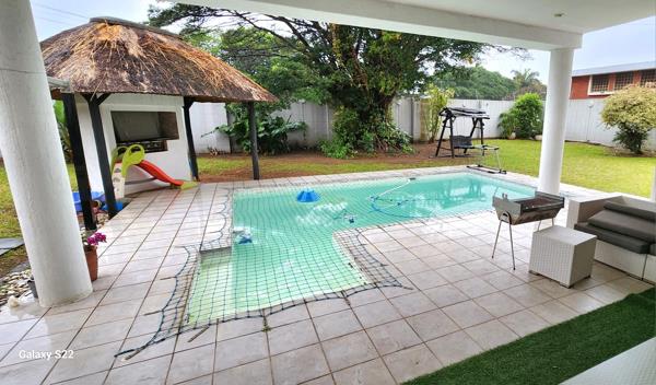 Welcome to this exquisite designed modern home, showcasing unparalleled luxury and sophistication. The property has 4 spacious bedrooms with air conditioning and BIC and all the rooms leading to a balcony over looking the pool and entertainment area. 2,5 Modern luxury bathrooms also leading to own balcony, open plan kitchen and dining room area with sleek high gloss finishes, top- of- the - line appliances, large centre island, 2 spacious lounges with sliding doors to out door entertainment, beautifully designed modern kitchen with soft close drawers, quartz counter tops. There is an expansive outdoor entertainment area with sparkling pool, private garden and braai area. Close proximity to top rated schools, easy access to major highways, nearby shopping centres and restaurants. The property is fully walled with electric fence, cctv cameras. There is distance sea views from this property. Plenty of parking and potential to add to the current building. Urgent Sale