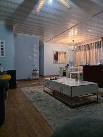 The lounge area includes a ceiling fan and opens out to a large, covered deck balconyperfect for hosting guests or enjoying relaxed outdoor meals. Down the hallway, youll find three generously sized bedrooms, each with built-in cupboards and the same stylish laminated floors. Both bathrooms are beautifully finished with showers, basins, and toilets, with the main bedroom enjoying the privacy of an en-suite.