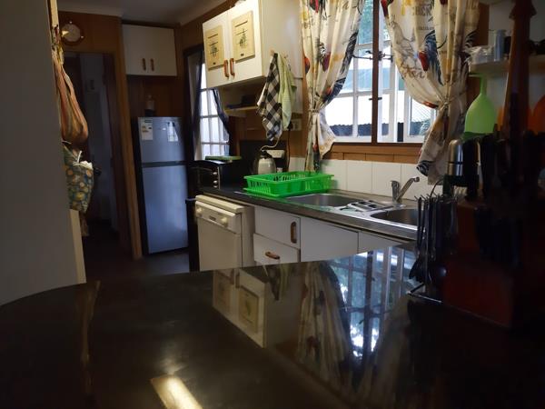The main house features generously sized bedrooms with built-in cupboards, bathrooms including a spa-like shower, a sleek kitchen with granite countertops, and waterproof laminate flooring throughout. The cozy lounge includes a ceiling fan, air conditioning (servicing needed), and curtains.