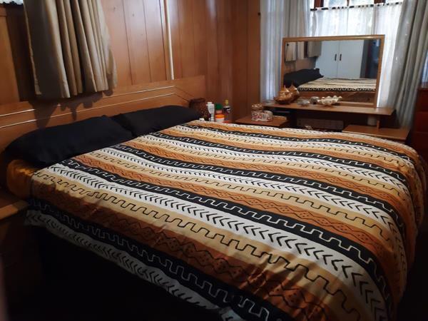 The flatlet boasts an open-plan bedroom with en-suite bathroom, built-in cupboards, and curtains, while the outdoor space offers an outdoor shower, two Wendy houses (one as a flatlet and the other for storage), and a backyard with a wooden bench and umbrella.
