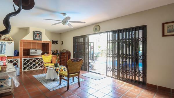 Additional features include an automated double garage with an extra enclosed carport and ample parking space in front of the property. This home is pet-friendly and secured with an alarm and CCTV system, complemented by a 24-hour patrol guard. For uninterrupted connectivity and power, the property is fibre-ready and equipped with an 8KW hybrid inverter, lithium batteries, and 8 solar panels, ensuring comfort during loadshedding. Premises include a commercial pool and open braai area for parties.