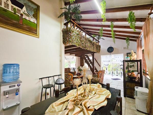 This beautiful home boasts high ceilings, exposed wooden beams, and light-coloured tiles, creating a warm and inviting atmosphere. The open-plan living area is thoughtfully designed to include a separate dining space for family dinners and a cosy lounge area for relaxation.