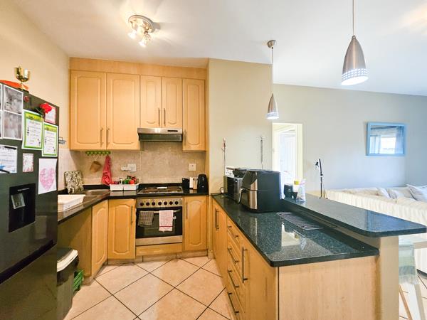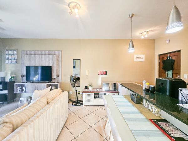 The unit comprises of a fully-fitted kitchen with granite countertops and two lovely pendant light shades hanging above the breakfast nook. Spacious living area that leads out onto a private patio. Two bedrooms with built-in cupboards. Air-conditioner in the master bedroom. Two full bathrooms one with a bath and one with a shower. Neatly tiled throughout.