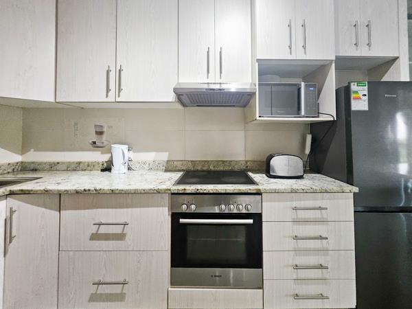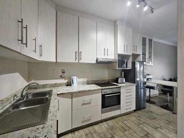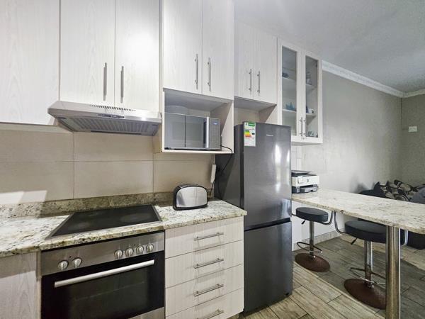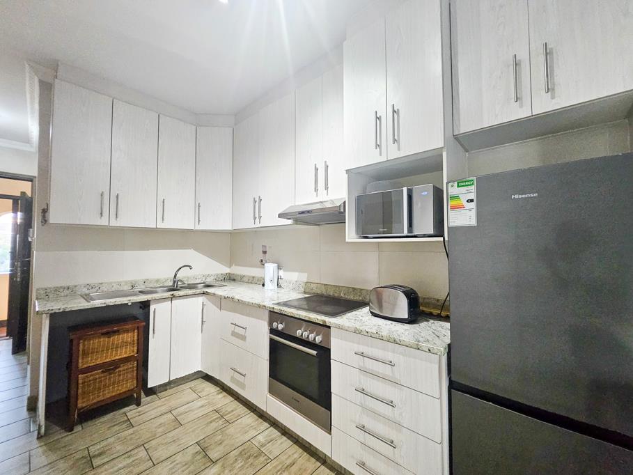 The kitchen is fully-fitted with white cabinets, granite countertops, a glass-top stove and a cosy breakfast counter. The living area is spacious with a beautiful cladding wall and it leads out onto a balcony with beautiful views of the garden. Two spacious bedrooms with plenty of built-in cupboard space. One modern bathroom with a neatly tiled shower.