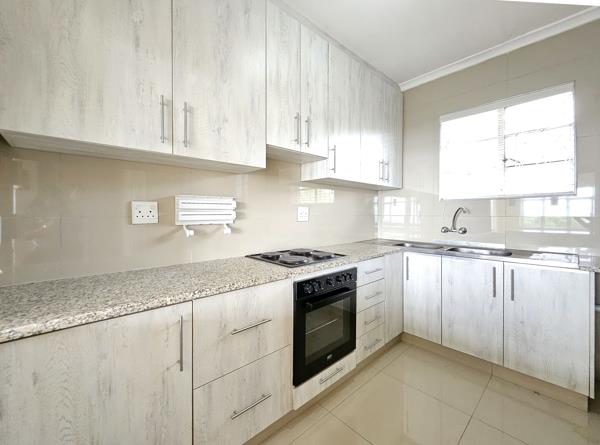 The kitchen is thoughtfully designed, featuring modern countertops and ample cupboard space. The open-plan layout seamlessly connects the lounge and dining area, distinguished by subtly elevated tiles and a floor-to-ceiling interior pillar.