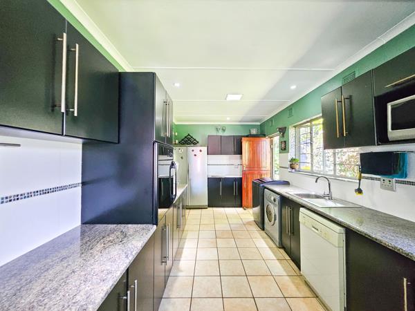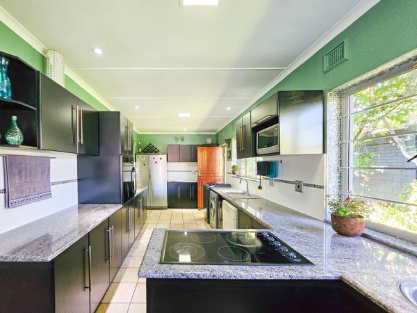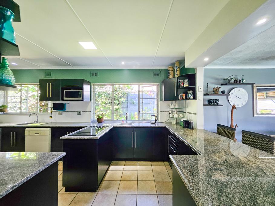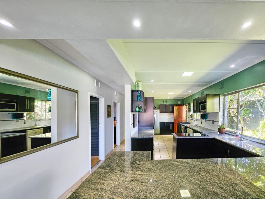 Inside, youll find a cosy family lounge that opens onto a generous covered patio, perfect for entertaining or relaxing with sundowners. The patio overlooks a large swimming pool, with the stunning beach views as its backdrop. At the opposite end of the lounge, youll find a remarkable kitchen with dark wood cupboards and light granite countertops.