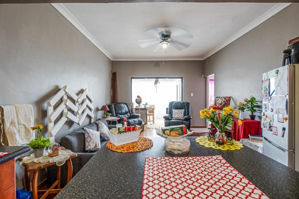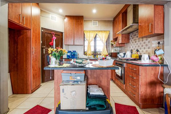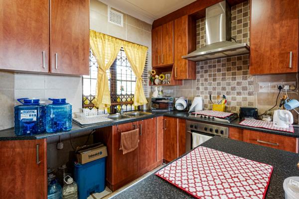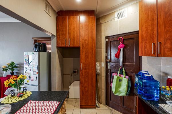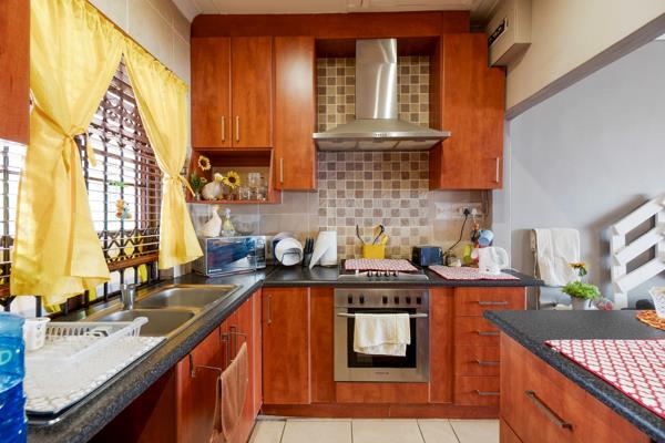 The spacious lounge, complete with a ceiling fan and wooden floors, flows seamlessly into a stylish cherrywood kitchen, featuring a built-in gas hob with an extractor fan and a centre island as prep area. Ample cupboards are found. The tiled enclosed balcony extending from the lounge, serves as a versatile spaceideal as an office, study, or additional sleeping areawith built-in cupboards for extra storage.