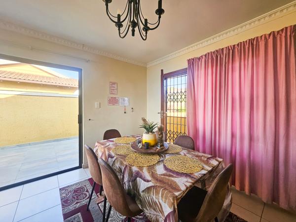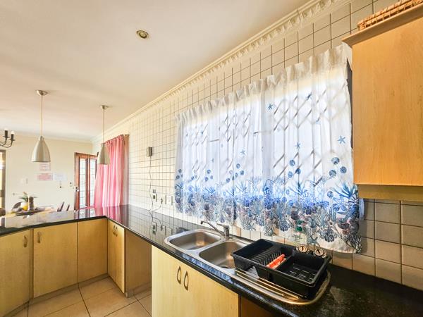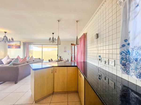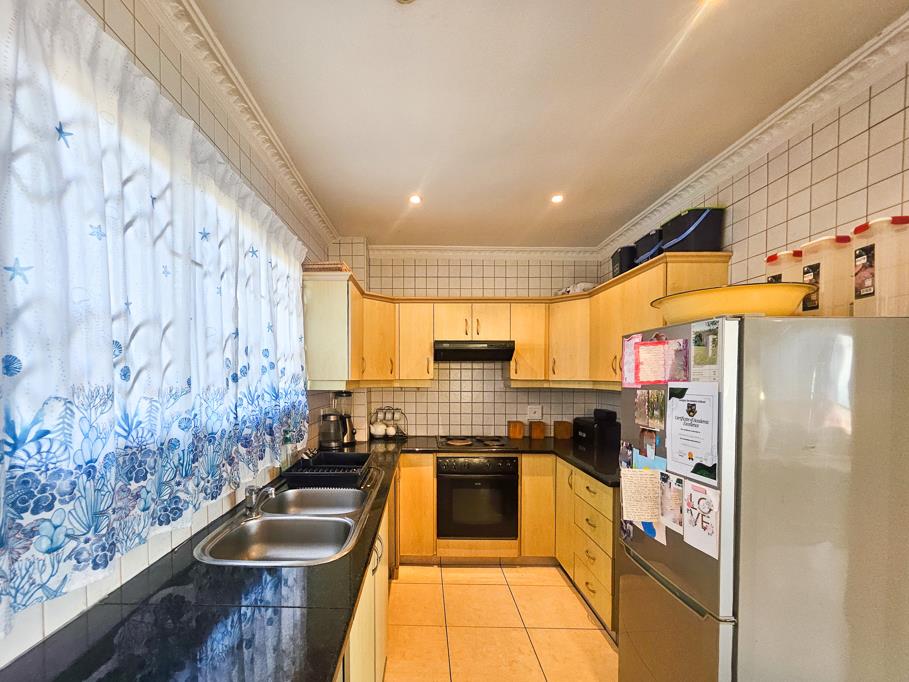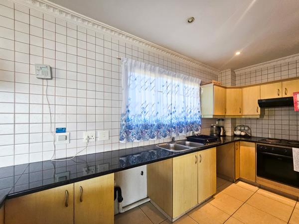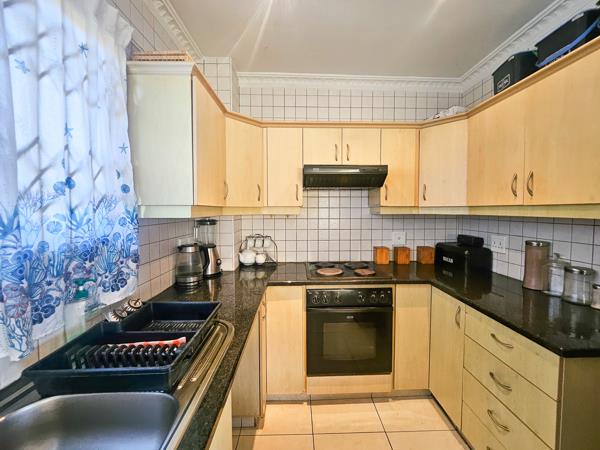 The modern kitchen is designed with style and function in mind, featuring granite countertops, an undercounter oven, hob, and extractor fan, along with plenty of cupboard space for storage. Three generously-sized bedrooms each include built-in cupboards, providing ample space. The main bedroom features an en-suite bathroom for added convenience, while a second bathroom with a separate toilet caters to the other two bedrooms.