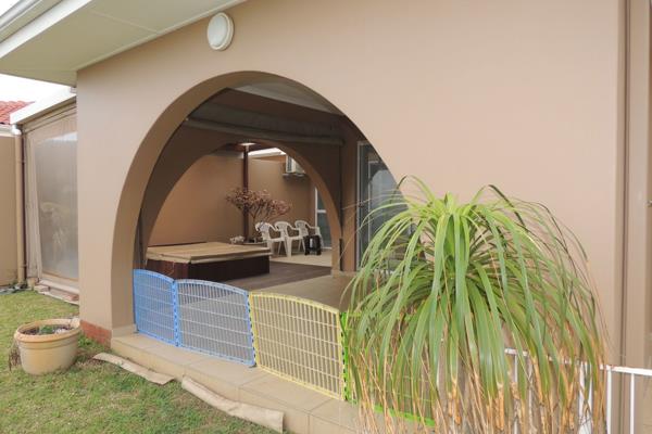 This property features 3 bedrooms, with 2 of them having en-suite bathrooms. All bedrooms are equipped with air conditioners, built-in cupboards, and block-out blinds. The kitchen is spacious, well-fitted with ample cupboard space, a separate scullery, and granite tops.