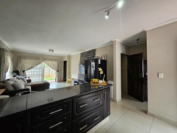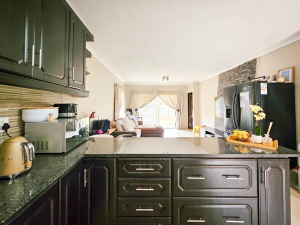 Modern townhouse for sale in Winklespruit. This modern and stylish unit is the perfect place to call home! The property is tiled throughout, adding a clean and polished look to every room. The contemporary open-plan kitchen, featuring sleek dark brown cupboards, offers ample cupboard and counter space, complete with elegant granite countertops and a glass-top stove. It flows seamlessly into a spacious lounge area that opens onto a lovely patio, ideal for relaxing or entertaining.
