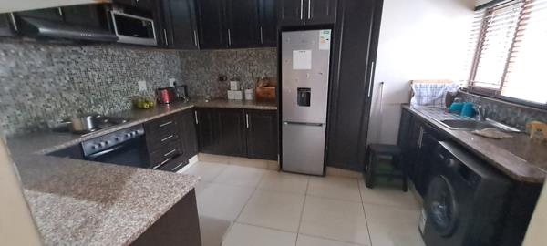 Lovely and spacious three bedrooms, all tiled with built-in cupboards, with the main bedroom having an aircon. There is a spacious open-plan living, lounge, and dining area with glass balustrades boasting a fully fitted kitchen. A tiled backyard.