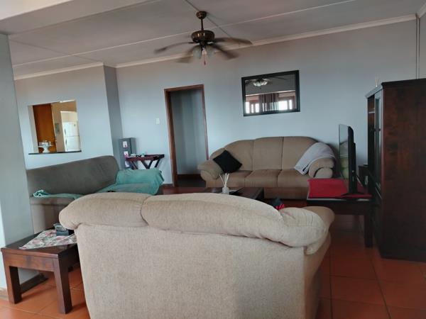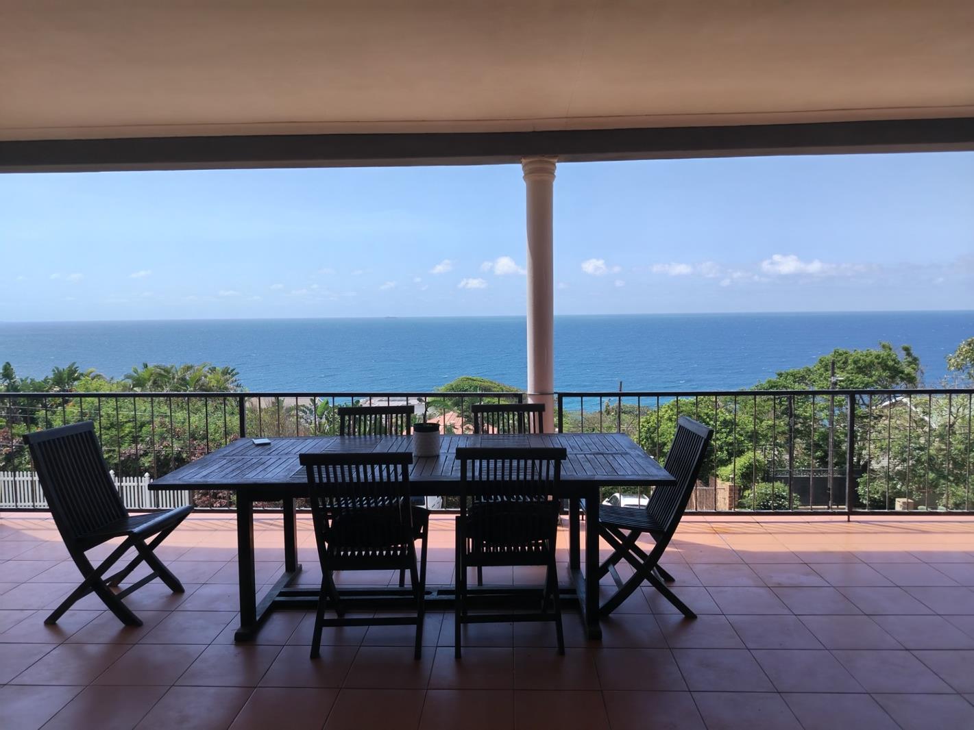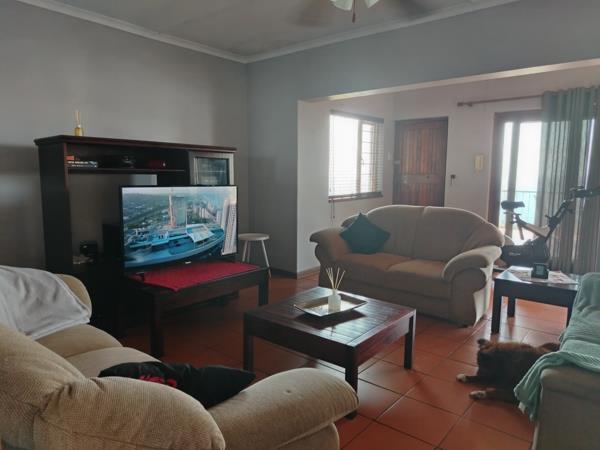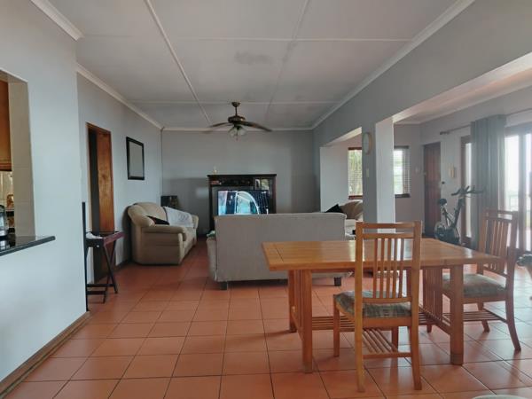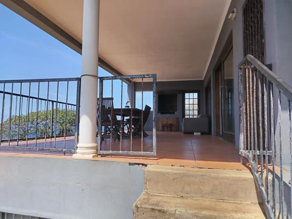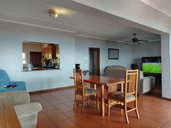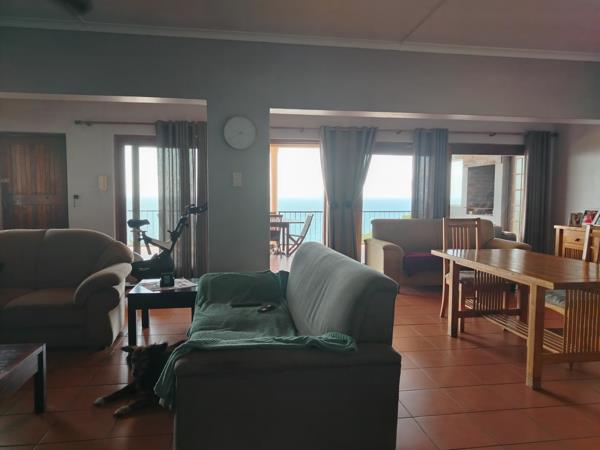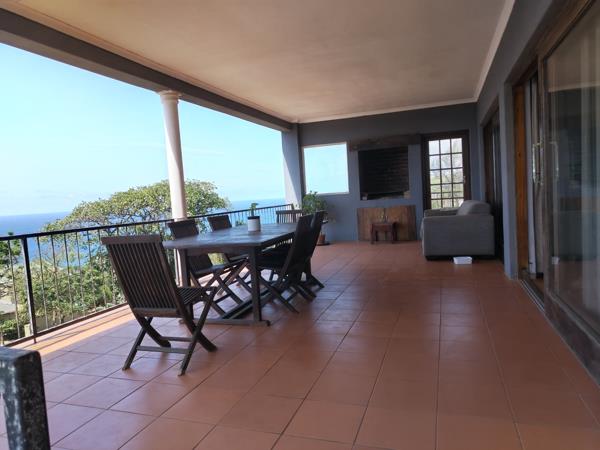 The open-plan living and dining areas flow beautifully onto an expansive entertainment patio featuring a built-in braai, bar area, and panoramic sea glimpses ideal for hosting in style or simply soaking in the ocean breeze.