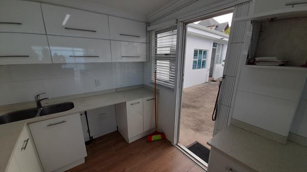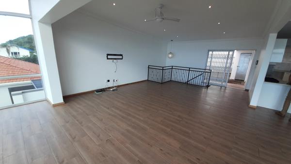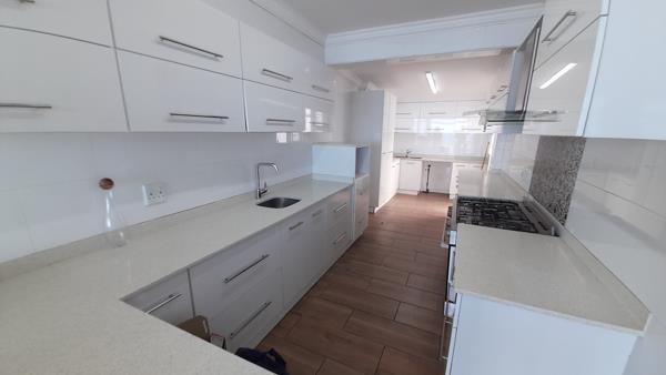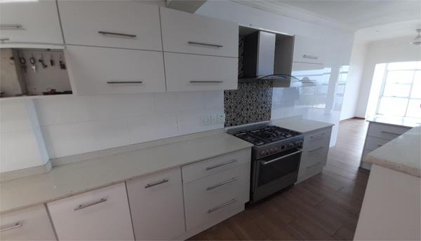 Stepping into the property behind an automated gate, you enter a large open-plan lounge and dining area fit for a king overlooking the pool downstairs, with an open-plan kitchen sporting Granite Tops, and it is super spacious. A gas stove and electric oven are fitted.