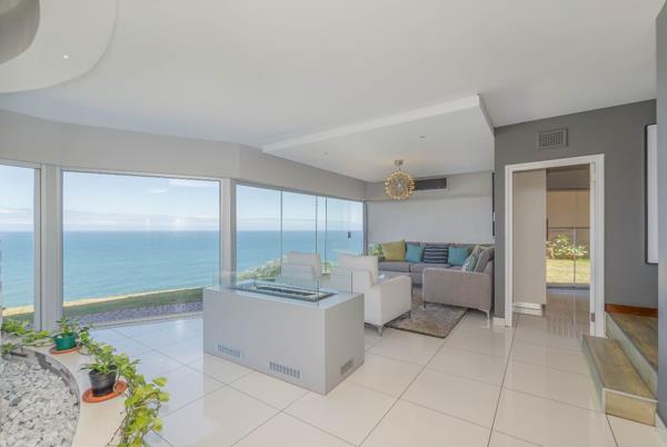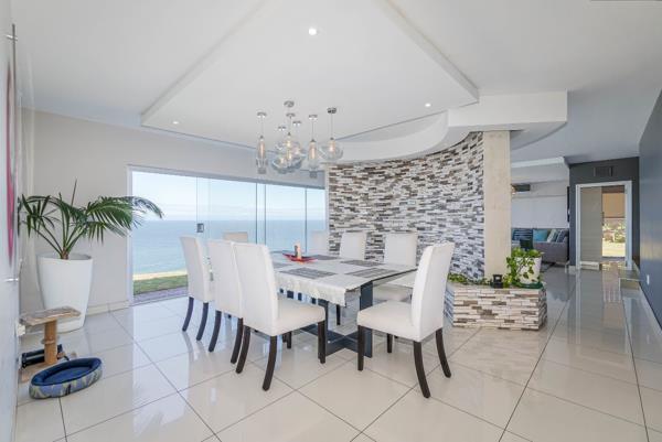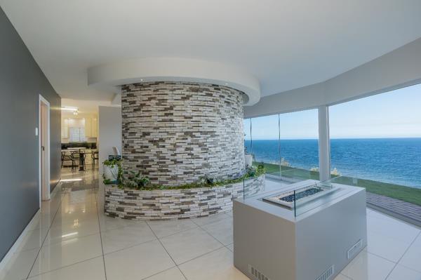 Downstairs consists of an open plan lounge and dining area.The lounge has a gas fireplace. The lounge and dining room are split by a curved load-bearing wall. The wall has been turned into a feature wall, with mosaic cladding tiles and an overhead water feature running the length of the curve, which cascades water over the tiles