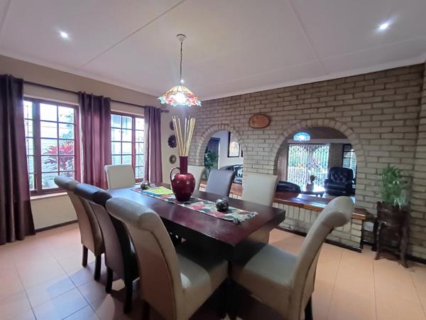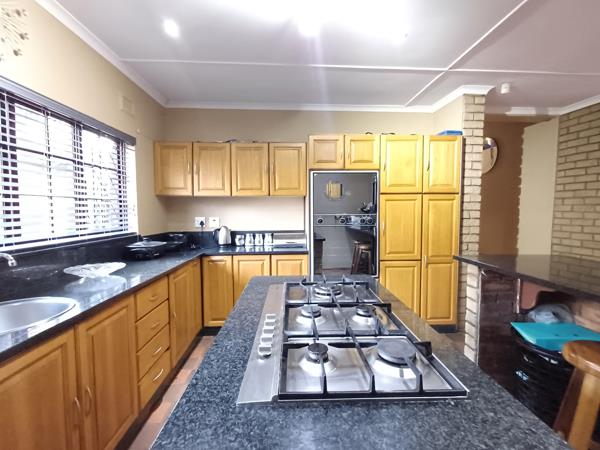 Step outside into a lush garden, featuring a sparkling pool illuminated for evening enjoyment. The massive, covered entertainment area is fully equipped with built-in braai facilities, making it ideal for hosting unforgettable gatherings.