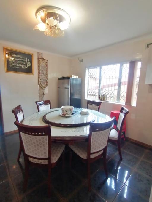 The kitchen seamlessly flows into a spacious dining area ideal for formal gatherings.