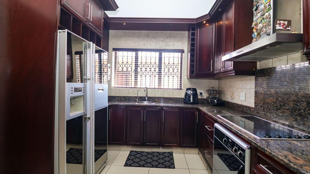 The kitchen is beautifully fitted with Rosewood cupboards and granite tops, leading directly to the open plan lounge and dining room.