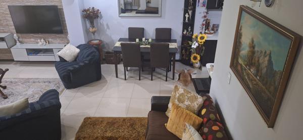 The open plan living and dining area is welcoming with ample natural light flowing in through the customized door and windows.