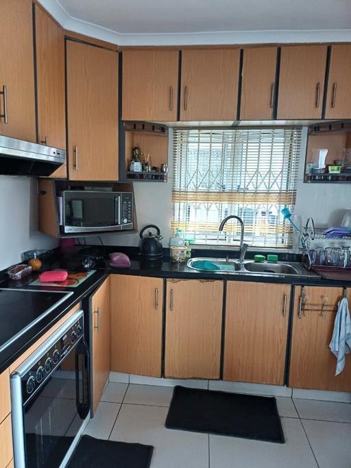 This 3 bedroom house very neat property, offers you fully fitted built in cupboards, burglar guards, aircons and aluminium windows. Situated above road level, fully walled automated gates, interior is fully tiled with porcelain tiles, open plan lounge, dining room, fitted kitchen with uco and hob.