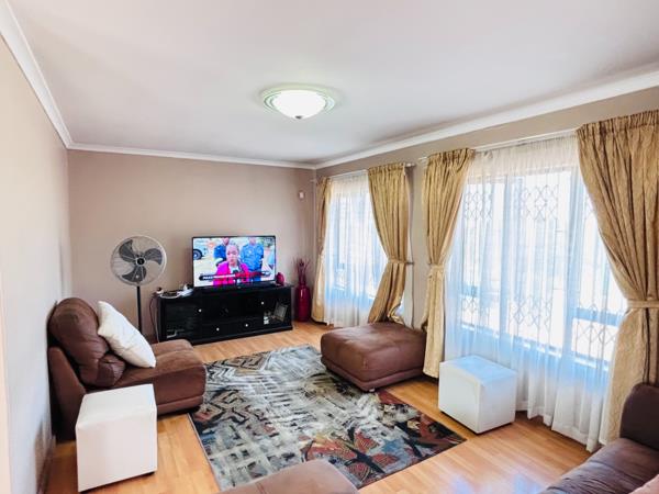 Beautiful home is fully secured with electric fence, burglar guards and an alarm system with sensors, there is an access gate and a neighbourhood security post next to the house. There is a main house and garden cottage in the property. The main house offers 3 bedrooms all with built-in-cupboards main room with an en-suite and access to balcony, a full family bathroom and separate toilet, spacious open plan lounge and dining area that leads to the patio, a fully fitted kitchen with a stove. The house is equipped with laminated flooring and tiles.
