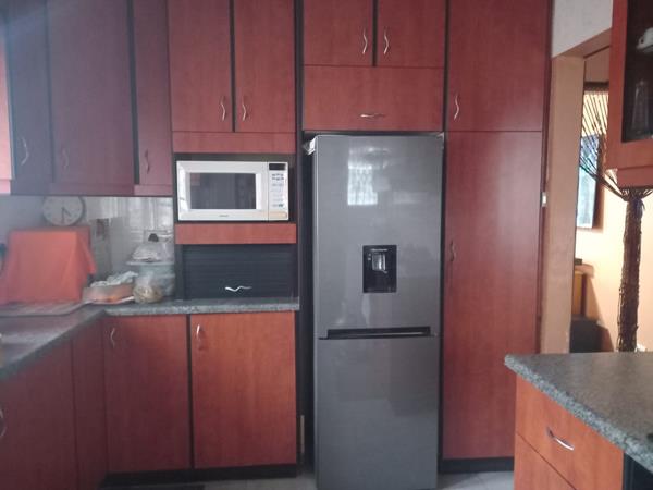 There are three fitted bedrooms leading from the dining room down the passage way, all with built in cupboards and one with an en-suite, fully tiled, consisting of a shower basin and toilet.