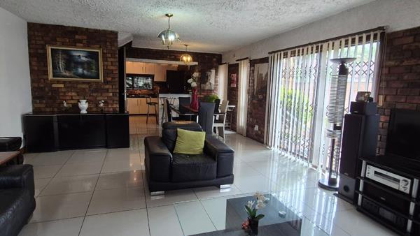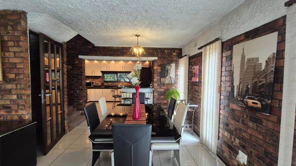Upon entry, the interior reveals an expansive open-plan design, seamlessly connecting the lounge, dining area, and two distinct kitchens ie the main kitchen and a scullery. Characterised by exposed brick accent walls and durable tiled flooring throughout, the living spaces exude a unique aesthetic. Select areas feature wooden ceilings, adding architectural interest. Large windows and sliding glass doors facilitate abundant natural light and provide a fluid transition to the exterior.
