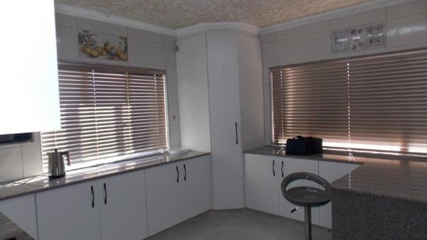 The large lounge and separate dining room, adorned with fitted blinds on aluminum windows, echoes warmth and space. All the aluminum windows have blinds. Safety is paramount with a full burglar-proof setup, CCTV cameras, and an alarm system linked to a vigilant armed response security company.