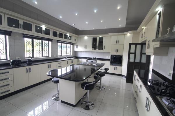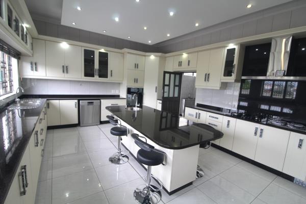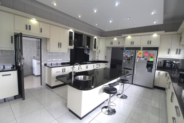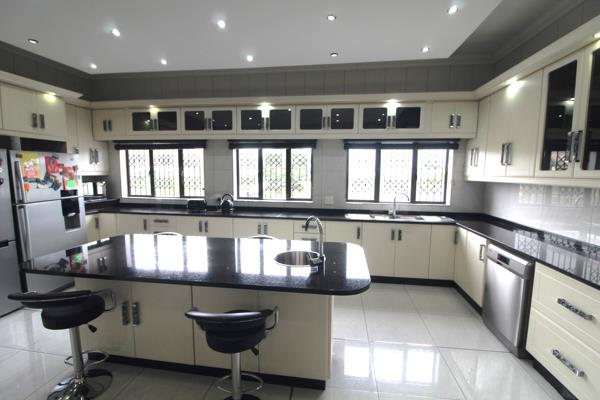 The open-plan lounge and dining room, complemented by air conditioning throughout, provide a seamless flow for entertaining. The fully tiled home features granite kitchen tops, a gas and electric stove, an eye-level oven, and an extractor fan. The kitchen also boasts a 5-seater center breakfast nook with a wash basin and a separate scullery, making meal prep a dream.