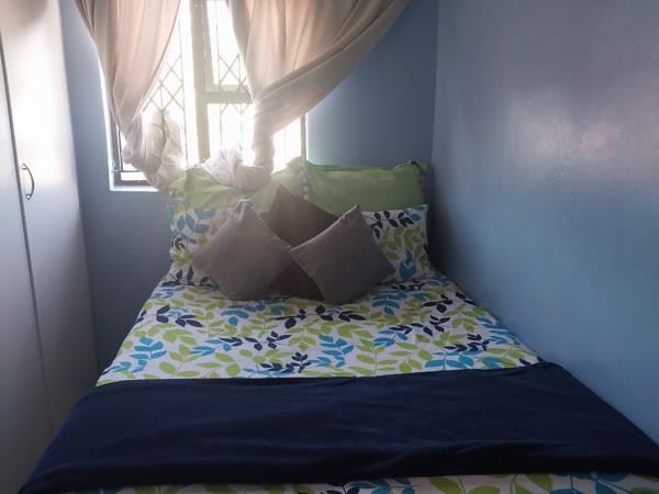 The bathroom is clean and functional, featuring a bath with shower hose. Both bedrooms offer ample built-in cupboard space.