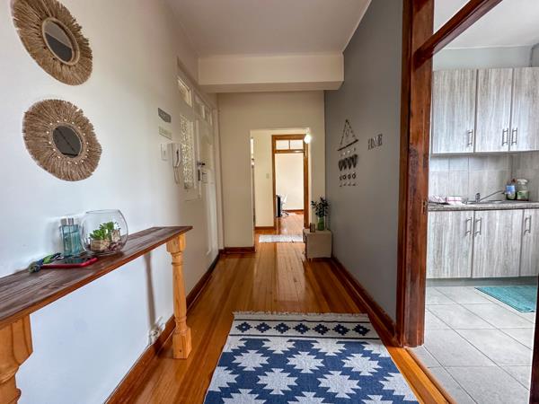 Venture down the passage to find a bathroom equipped with a shower and basin, plumbed for a washing machine, and a separate toilet. Two generously sized bedrooms with built-in cupboards offer space for double beds and side tables.
