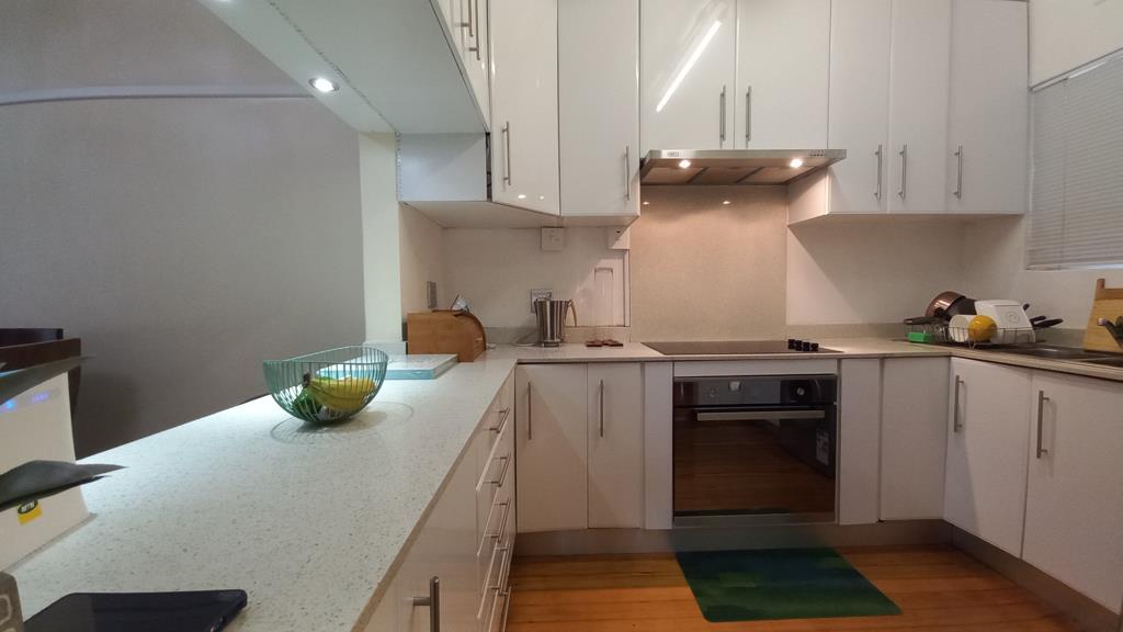 This beautifully renovated gem is on the Ground Floor and has much to offer. 3 spacious bedrooms, 2 of the rooms have built in cupboards, the main leads onto the enclosed balcony. The kitchen is modern with lots of cupboards and granite counter tops. There is a full bathroom, as well as a guest toilet. Well maintained wooden floors are throughout the apartment which also offers aluminium window frames with burglar guards. The apartment comes with a lock up garage. There is an electric fence around the complex and remote access to the main gate which has drive in access at the back. Located close to schools, hospitals, shopping centres