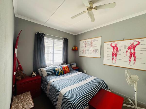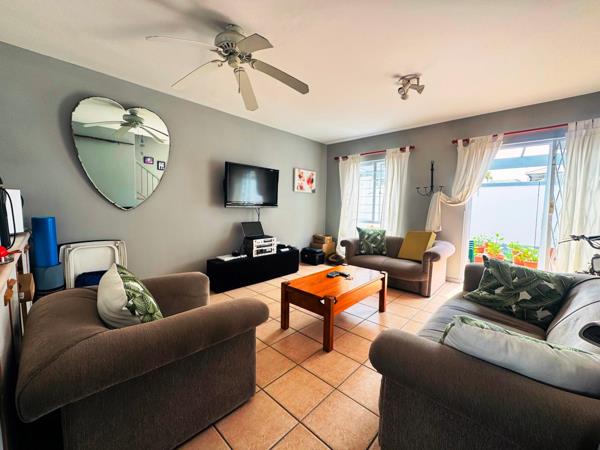 Adjacent to the kitchen, the spacious, fully tiled lounge area offers a comfortable living space and is fitted with an air conditioner. The lounge area leads out to a well-kept private garden, ideal for relaxing or entertaining.