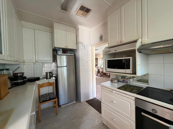 The functional kitchen is equipped with white cabinetry, integrated oven and hob, and a stainless steel refrigerator, providing ample storage. The property features three well-proportioned bedrooms and three bathrooms, ensuring comfortable accommodation. Practical amenities include two garages, additional parking, and a covered carport. The floor size is 206 square metres.